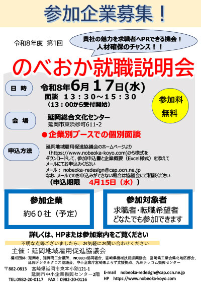 延岡地域雇用促進協議会では、以下の日程で「令和8年度 第1回 のべおか就職説明会」を開催します。